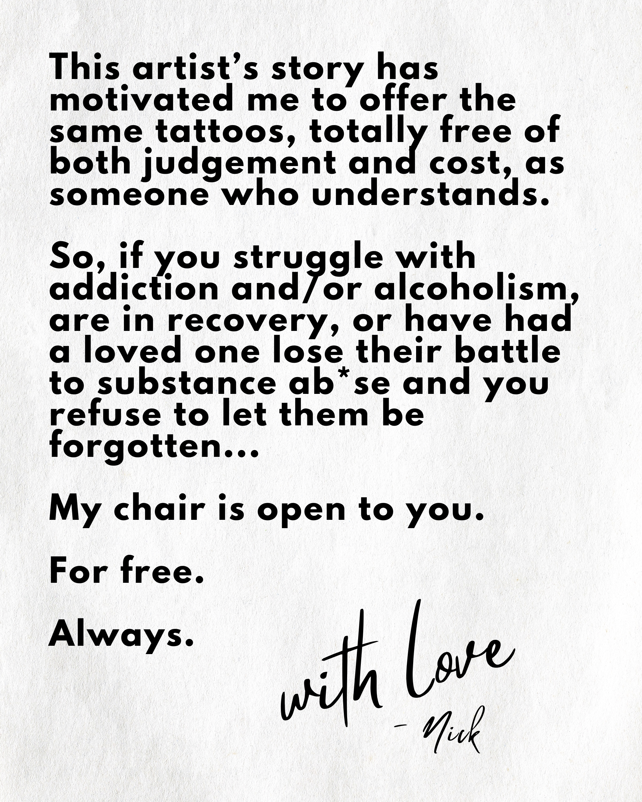 #onetattooatatime is an artist-led monthly recurring event designed by Nick Tyler Tattoo which offers free tattoos for people whose lives have been touched by addiction. No judgment. No spectacle. No cost.