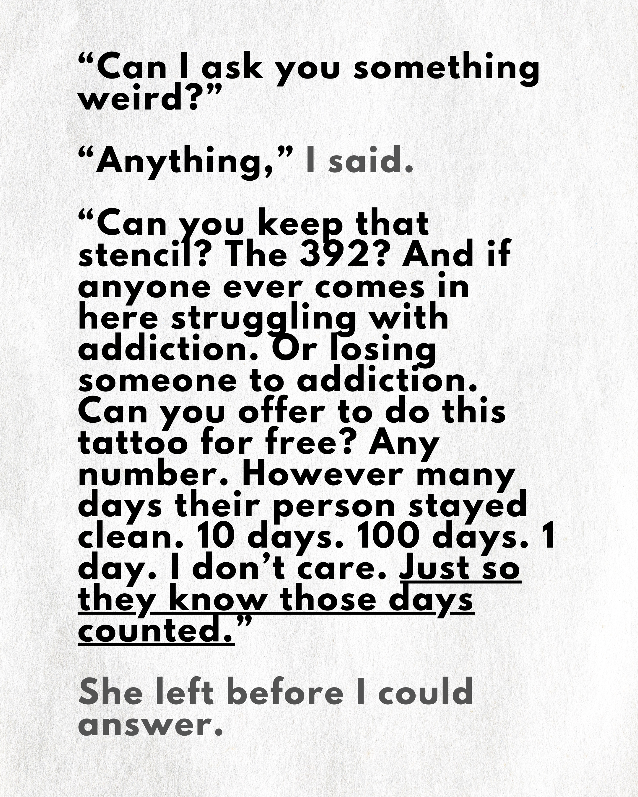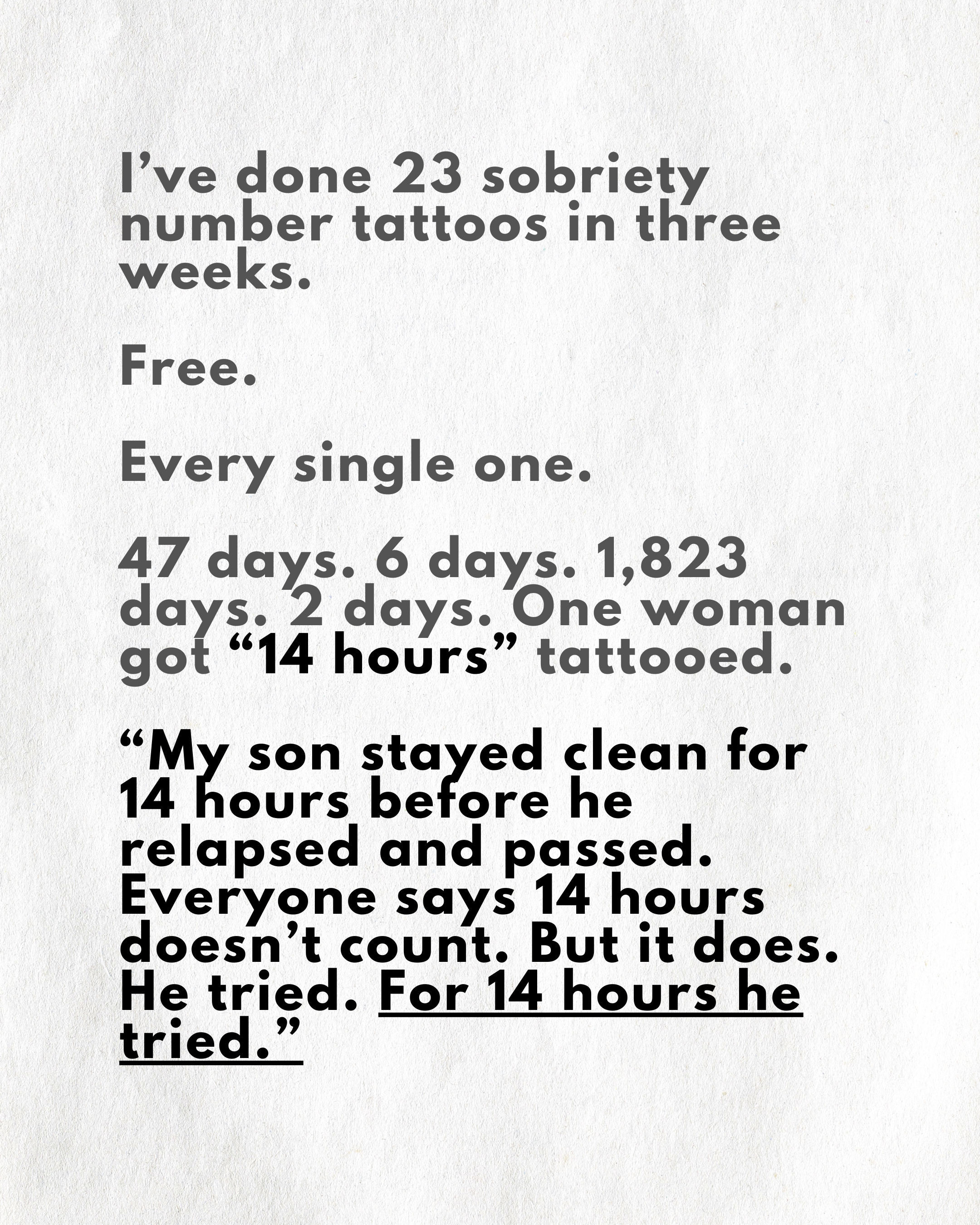 What I will ask you: basic contact info, your connection to addiction, a brief description of what your number means to you and where you'd like your tattoo placed.