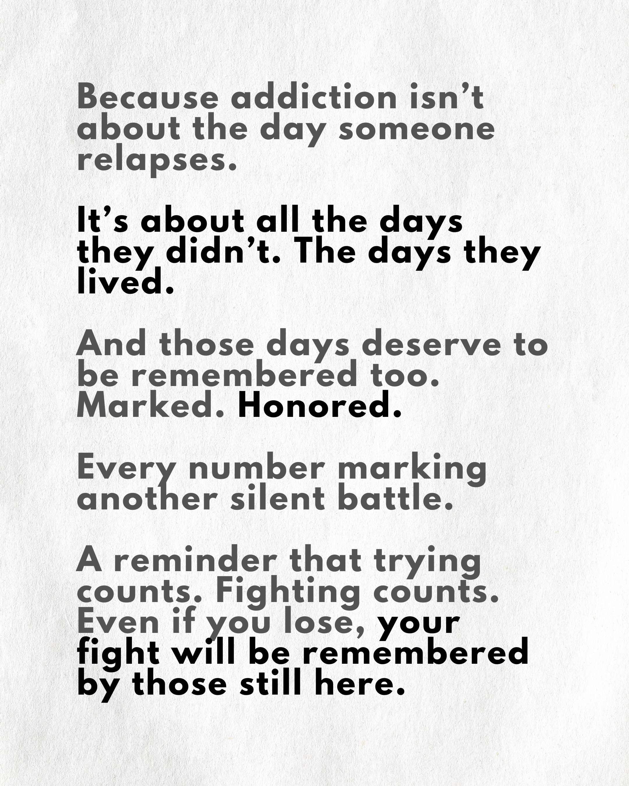 this event exists to give your story a permanent, visible home. My hope, with your help, is to shift the conversation that surrounds addiction, recovery, relapse, loss, and grief relating to those lost to this disease. Any and every period of recovery deserves to be celebrated.